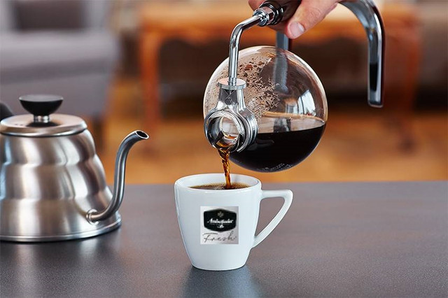 Коли вода переміщається з дна у верхню посудину і досягає температури 90 ° C, додайте каву Ambassador Fresh. Бариста рекомендують особливо для заварювання кави в сифоні мелена Ambassador Fresh Kenya AA, Colombia Supremo або Costa-Rica SHB.