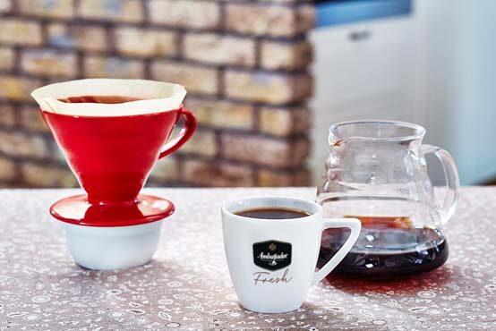 Подумніть і подрібніть досить велику каву Ambassador у пропорції 6 г/100 мл. Бариста рекомендує свіжообсмажену каву Ambassador Fresh Kenya AA, Colombia Supremo, особливо для заварювання кави через пуровер.