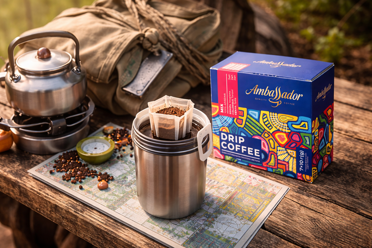 Кава бренду Ambassador у форматі дріп-кави — це практичне рішення для тих, хто часто в дорозі або хоче мати запас кави «на всяк випадок».